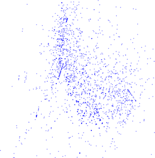 This is the communication network of the Galician Wikipedia. Nodes represent